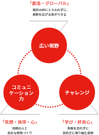 ものづくり領域における変化や課題を敏感にキャッチし、世界中のパートナーと共に新たな価値を創出するという、当社の未来を実現するには、社員全員一丸となり変革と挑戦を加速し、持続可能な未来を創出していきたいと考えています。 変革と挑戦を加速するためには、“広い視野”、“コミュニケーション力”、“チャレンジ”の3つのキーワードが重要であると考えております。